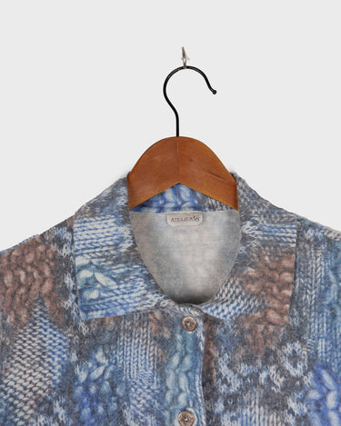Vintage 80s blue / colorful crazy pattern fine knitted 3/4 sleeve shirt | S - M
