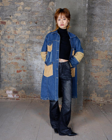 Introducing the ultimate vintage coat - a double lined denim and soft corduroy combo that will keep you warm and stylish! Perfect for sizes M to L and a must-have for any patchwork fabric lover. Don't miss out on this unique addition to your wardrobe!