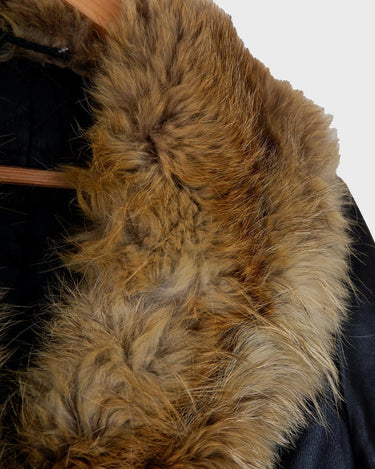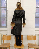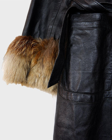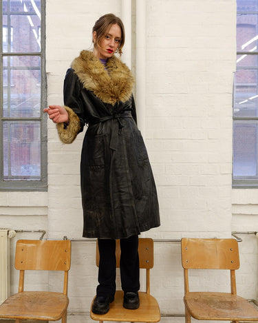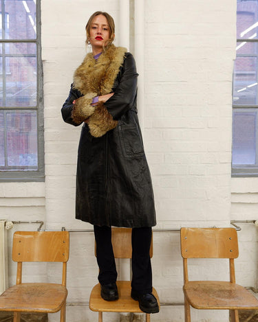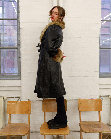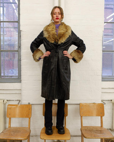 Premium Vintage 70s black leather penny lane coat with real fur (thin coat) | M