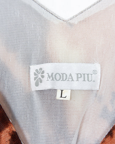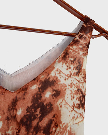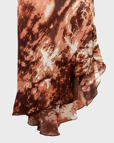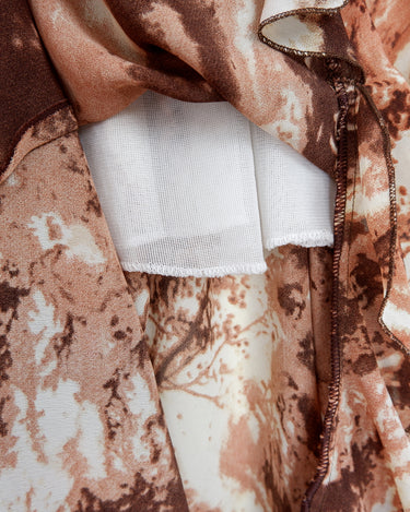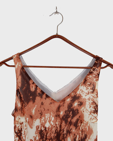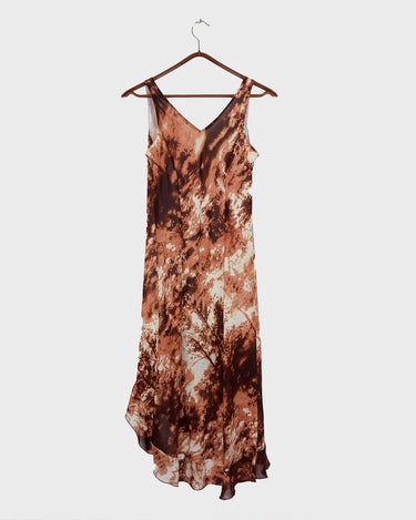 Vintage 90s Moda Piu asymmetrical maxi dress in brown and beige with a tie-dye pattern | S-M