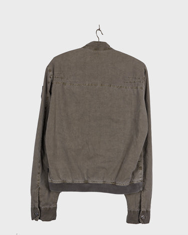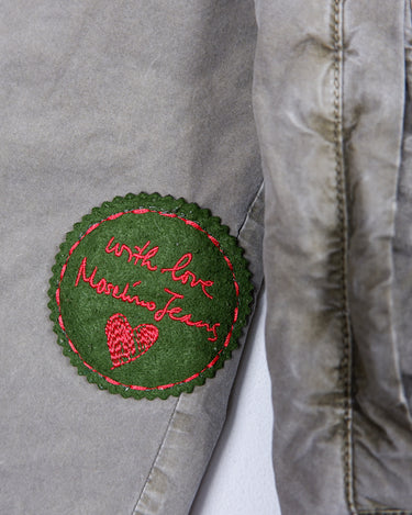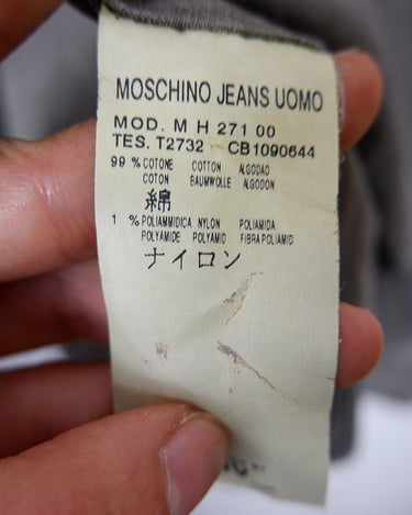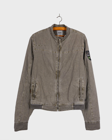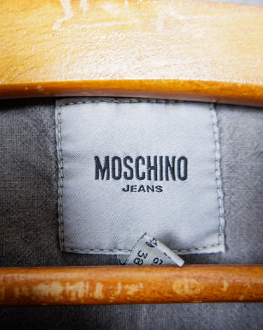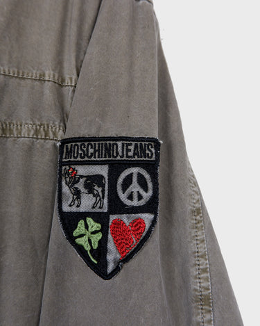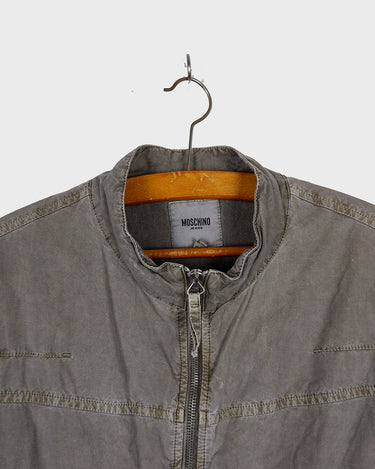 Vintage 90s / early 2000s MOSCHINO JEANS jacket in washed taupe-grey with patches (lightweight and distressed) | M-L