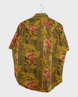 Easy to wear, hard to ignore. This vintage 90s shirt with its single chest pocket features a bold botanical print in softly faded yellow, green, and soft pink tones. The relaxed L-XL fit and lightweight fabric make it a comfortable go-to for laid-back days.