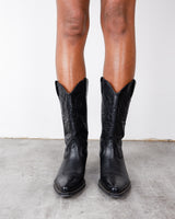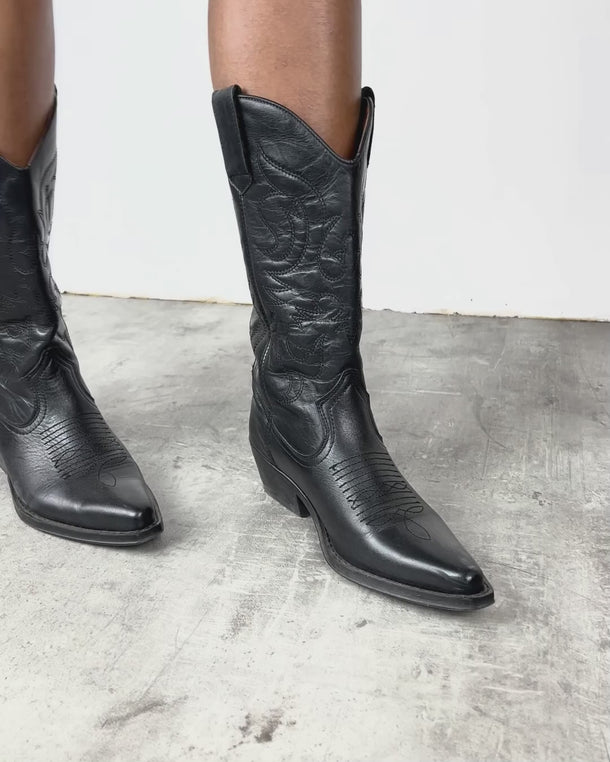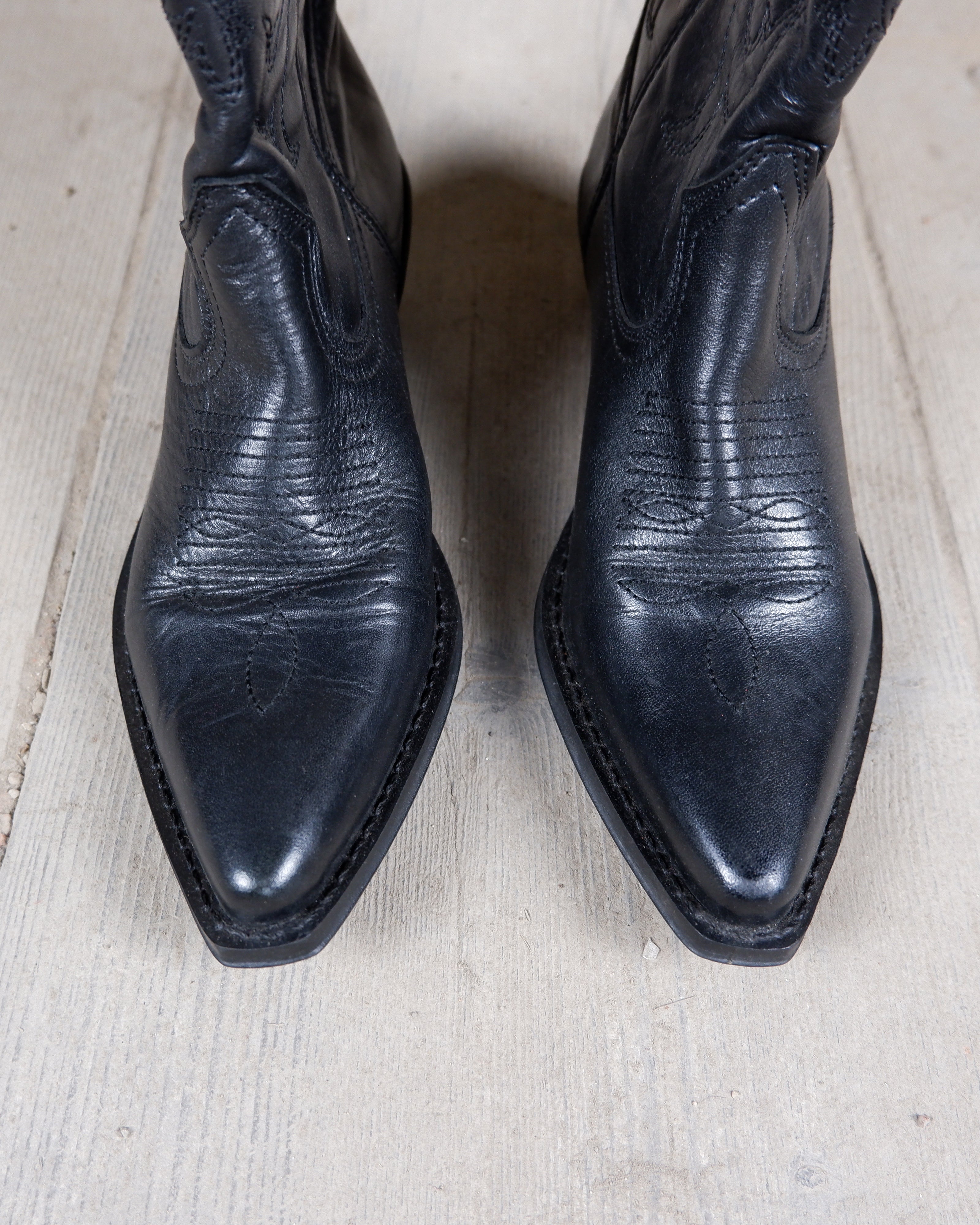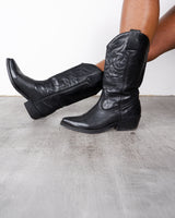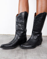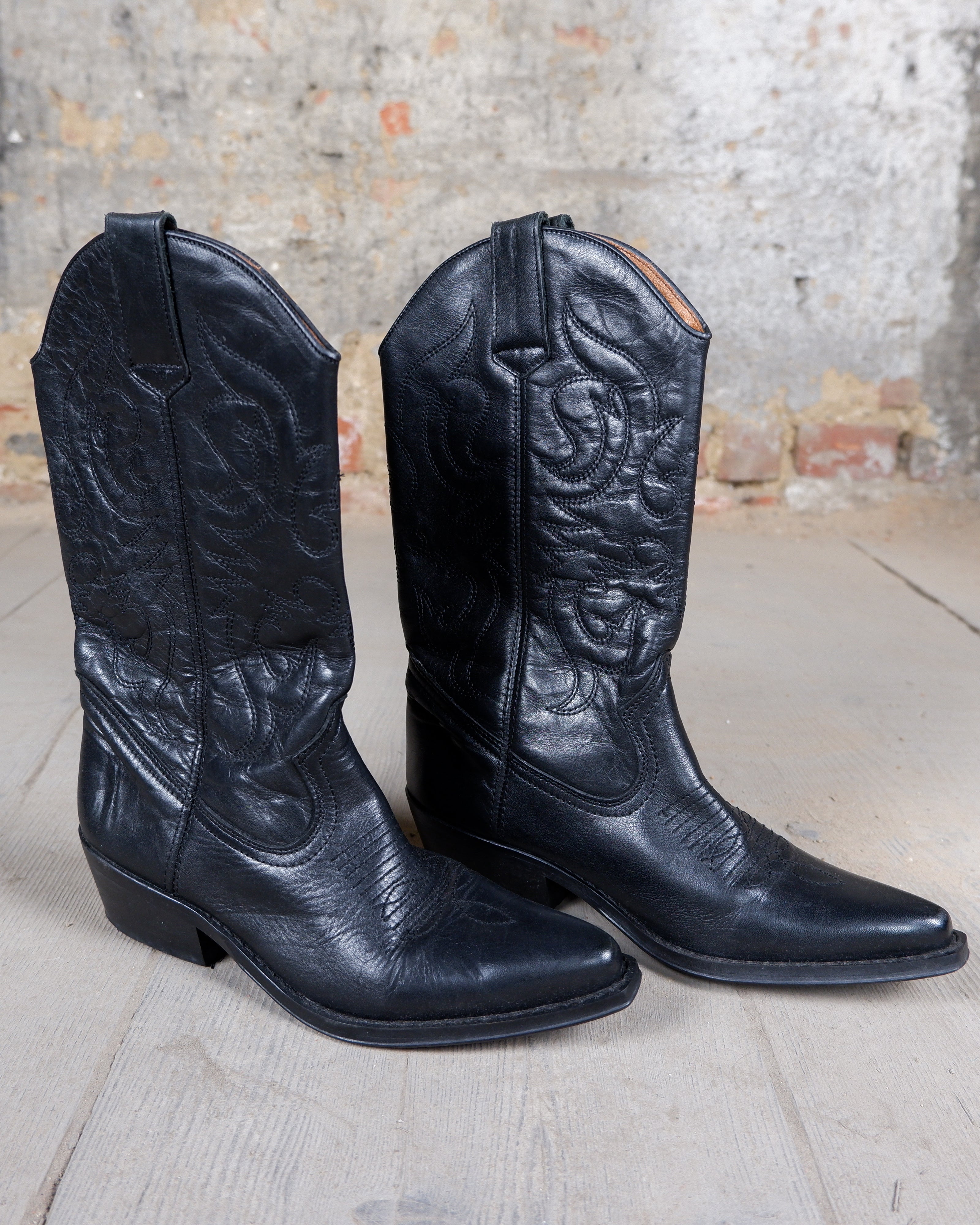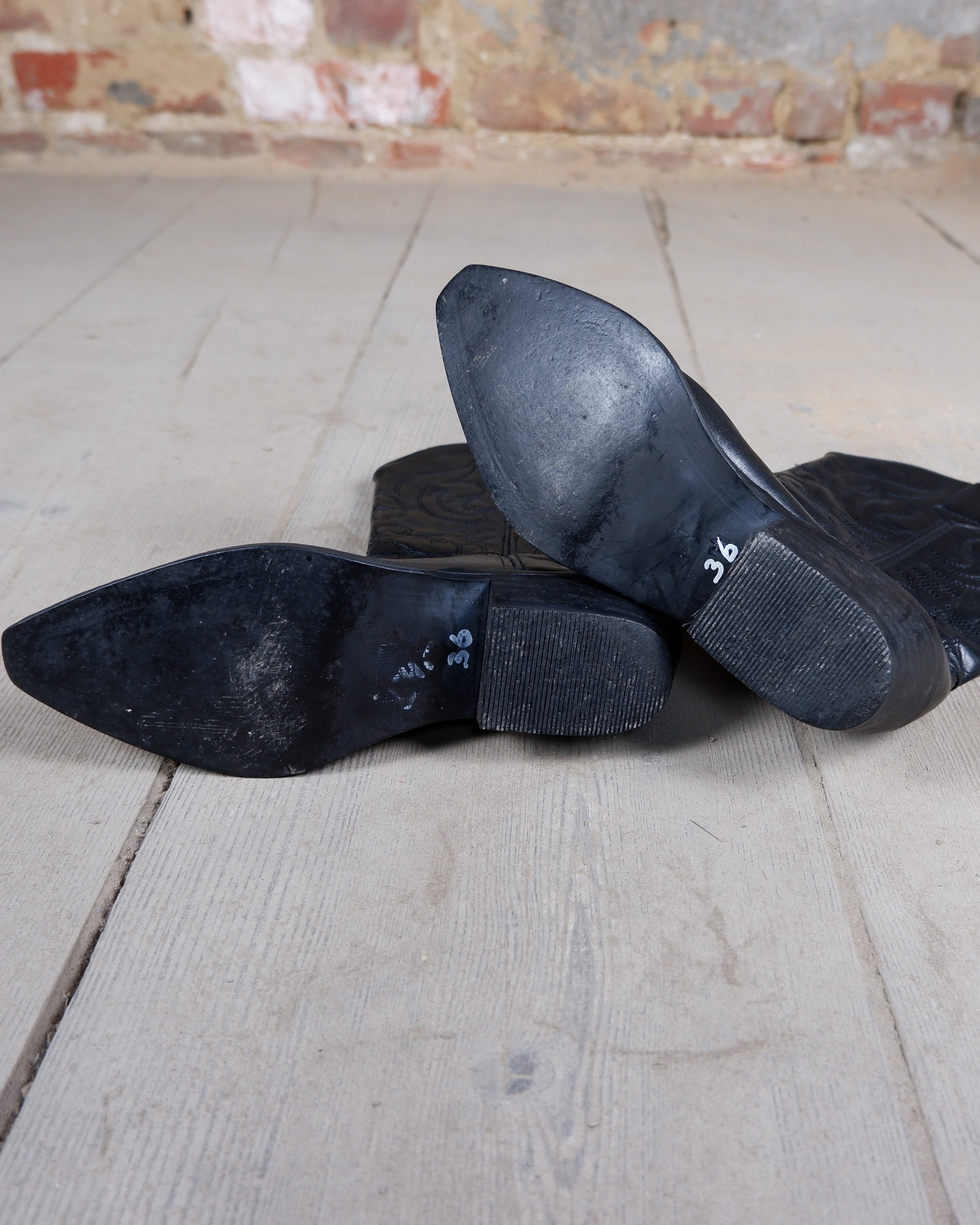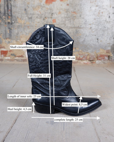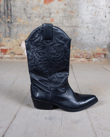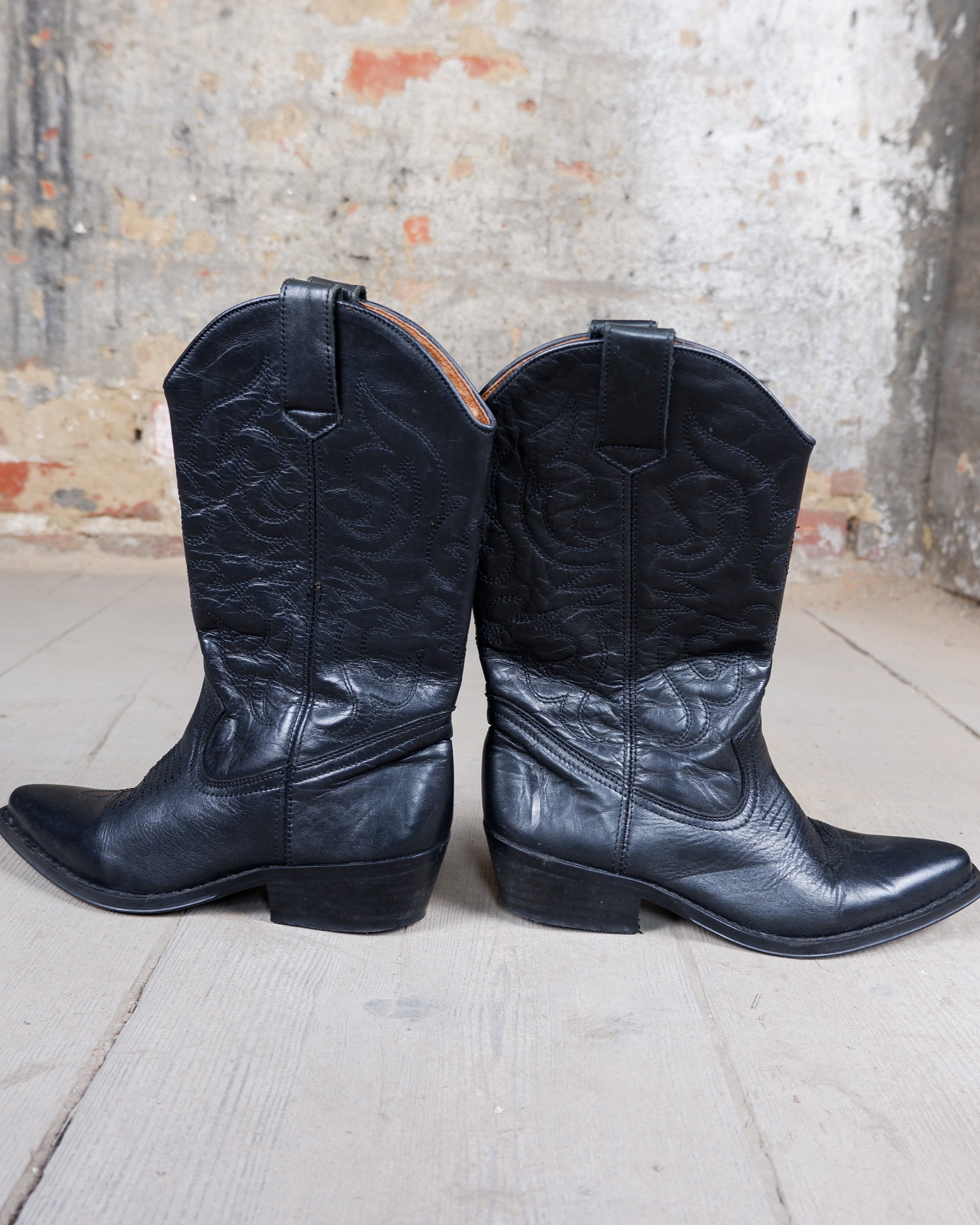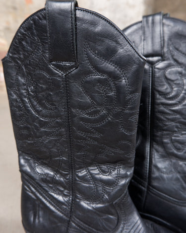 Vintage cowboy leather boots in black with classic Western embroidery and a naturally worn leather texture. The deep black color and tonal stitched pattern give them an authentic, timeless look that never feels overdone. A rare vintage piece in EU size 36  perfect if you want real character.