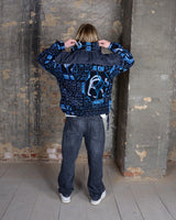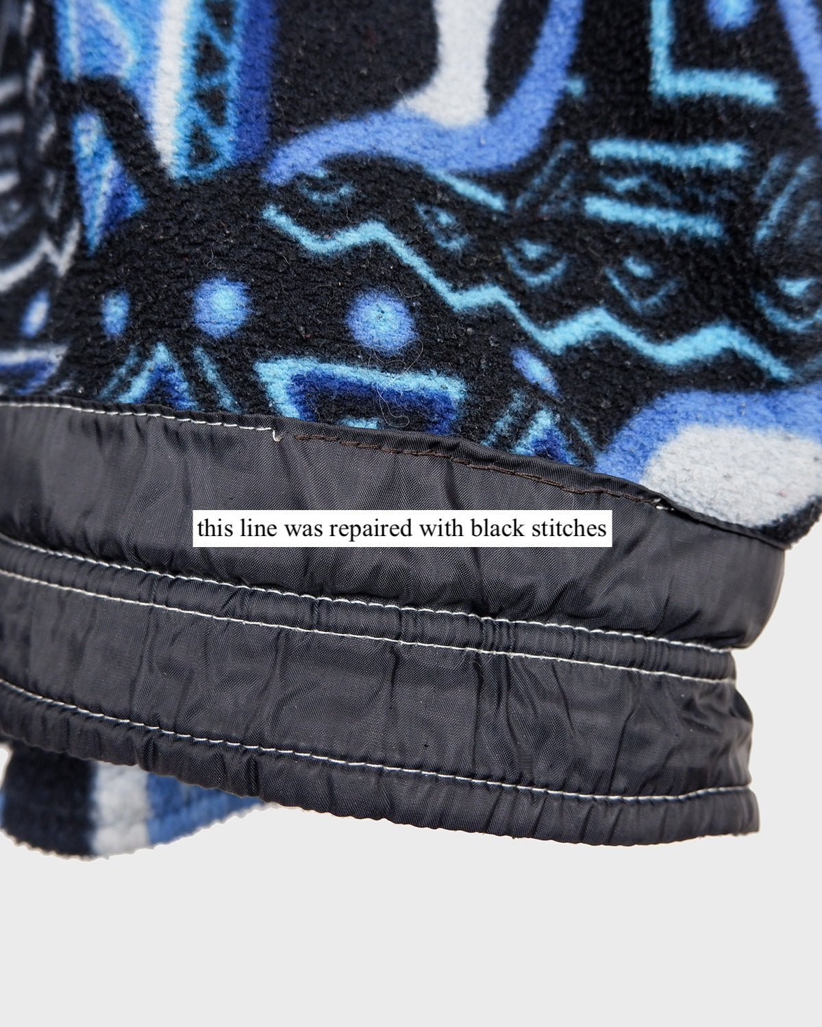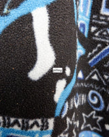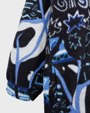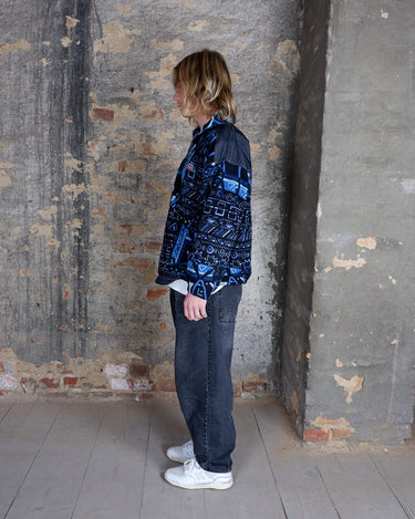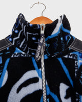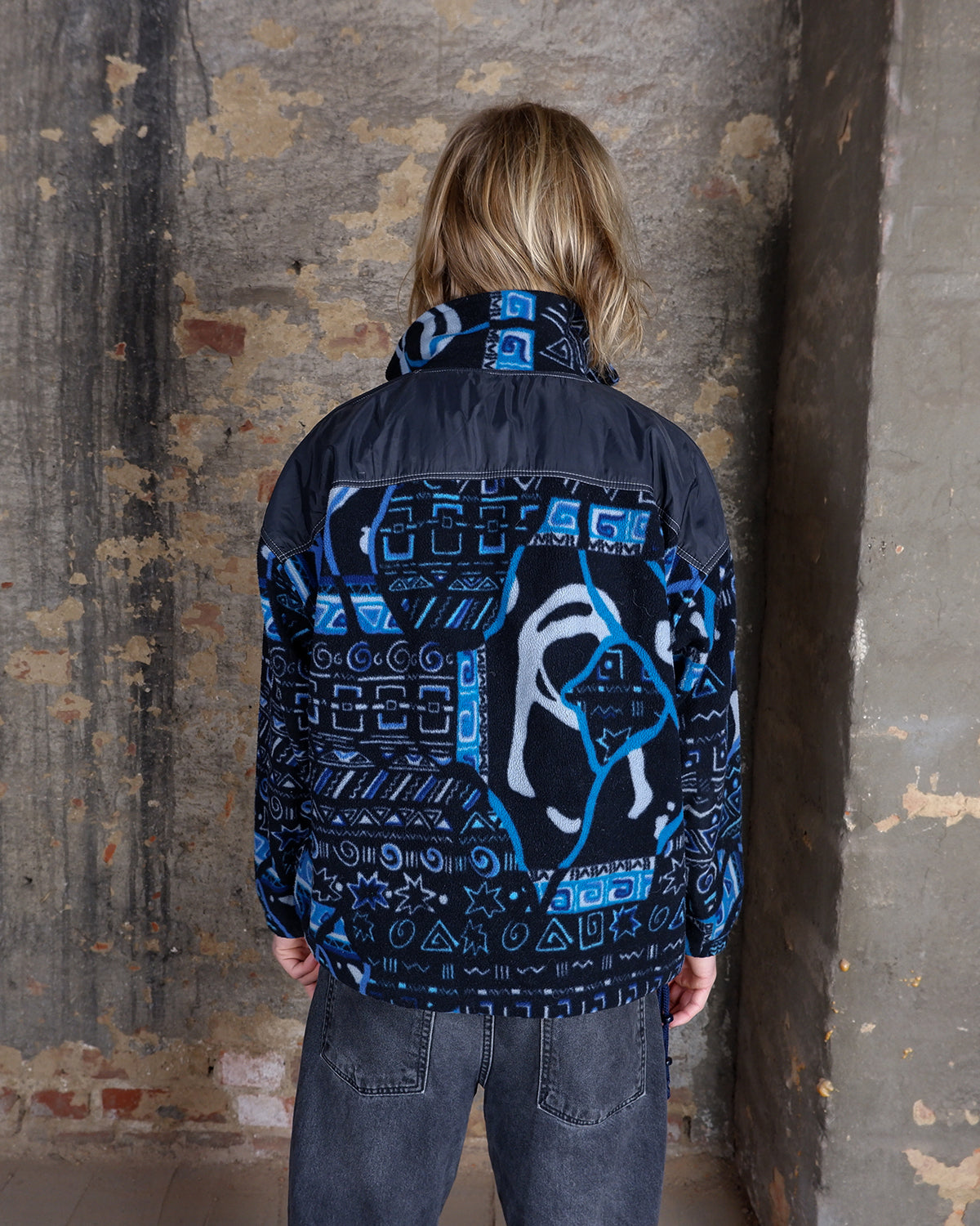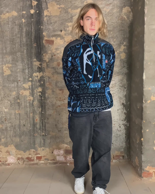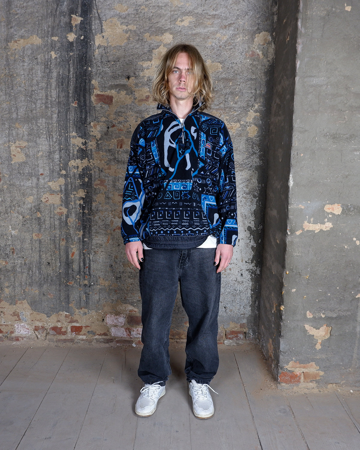 Vintage Airone half-zip fleece in black with blue graphic patterns for a laid back vibe. The soft fleece material offers cozy warmth, while the half-zip design and relaxed fit keep it casual and versatile. A perfect piece for streetwear, layering or everyday wear.