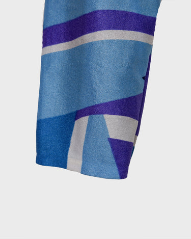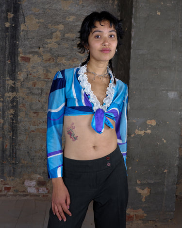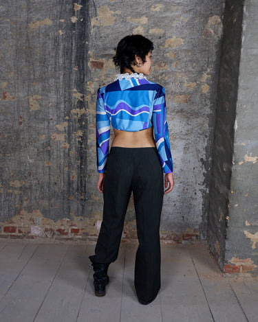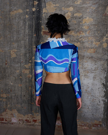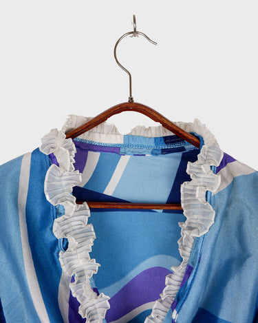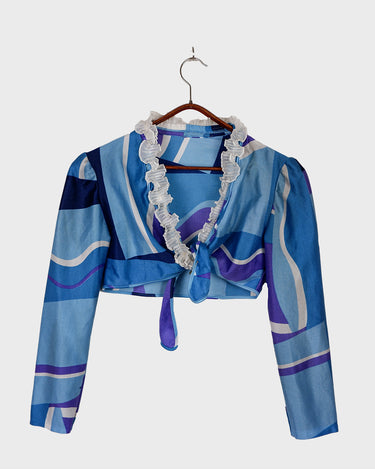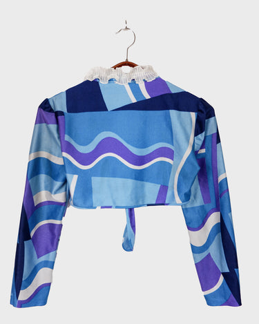 Vintage 70s crop top with wave print in blue and purple with ruffled collar | XS-S