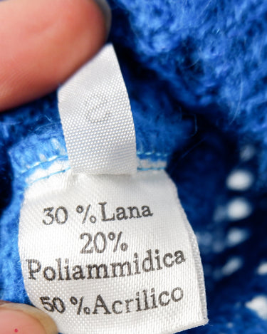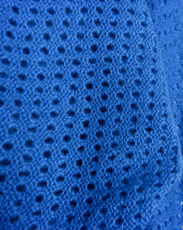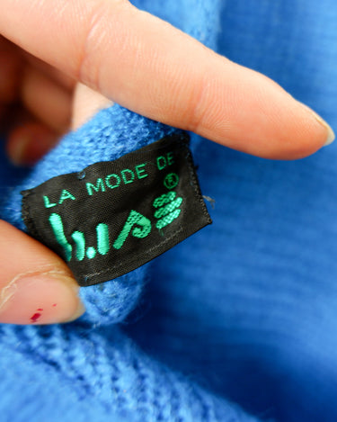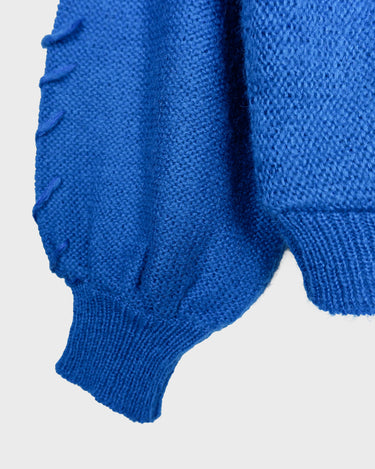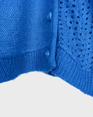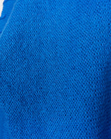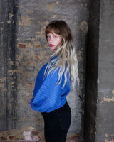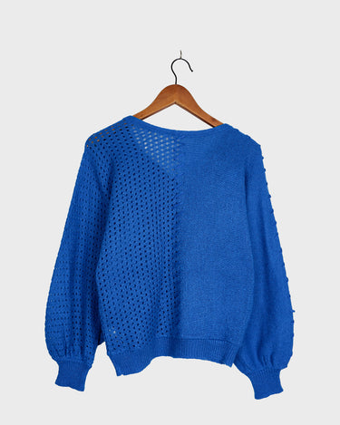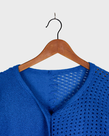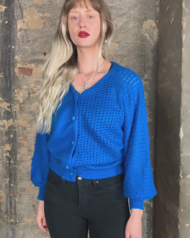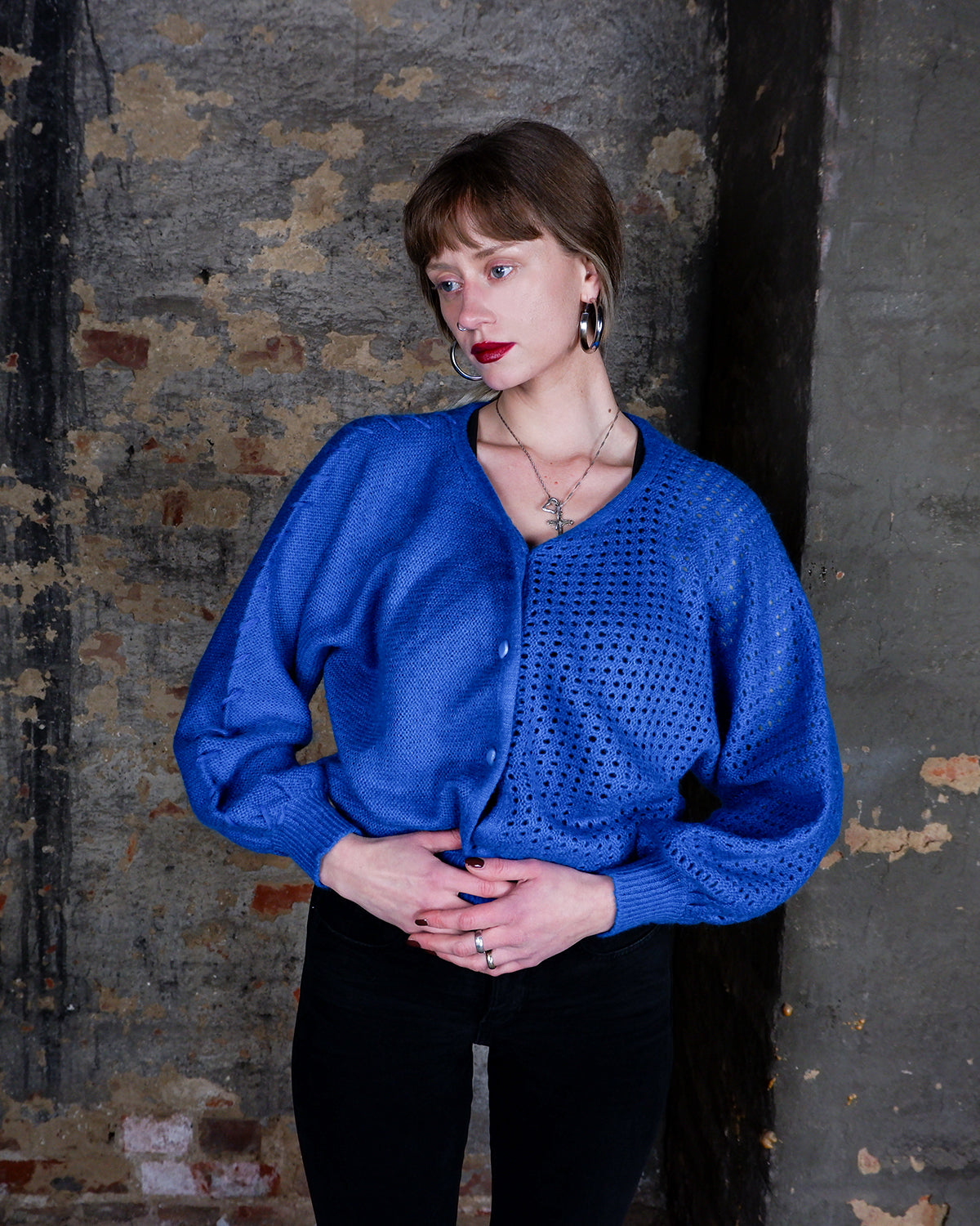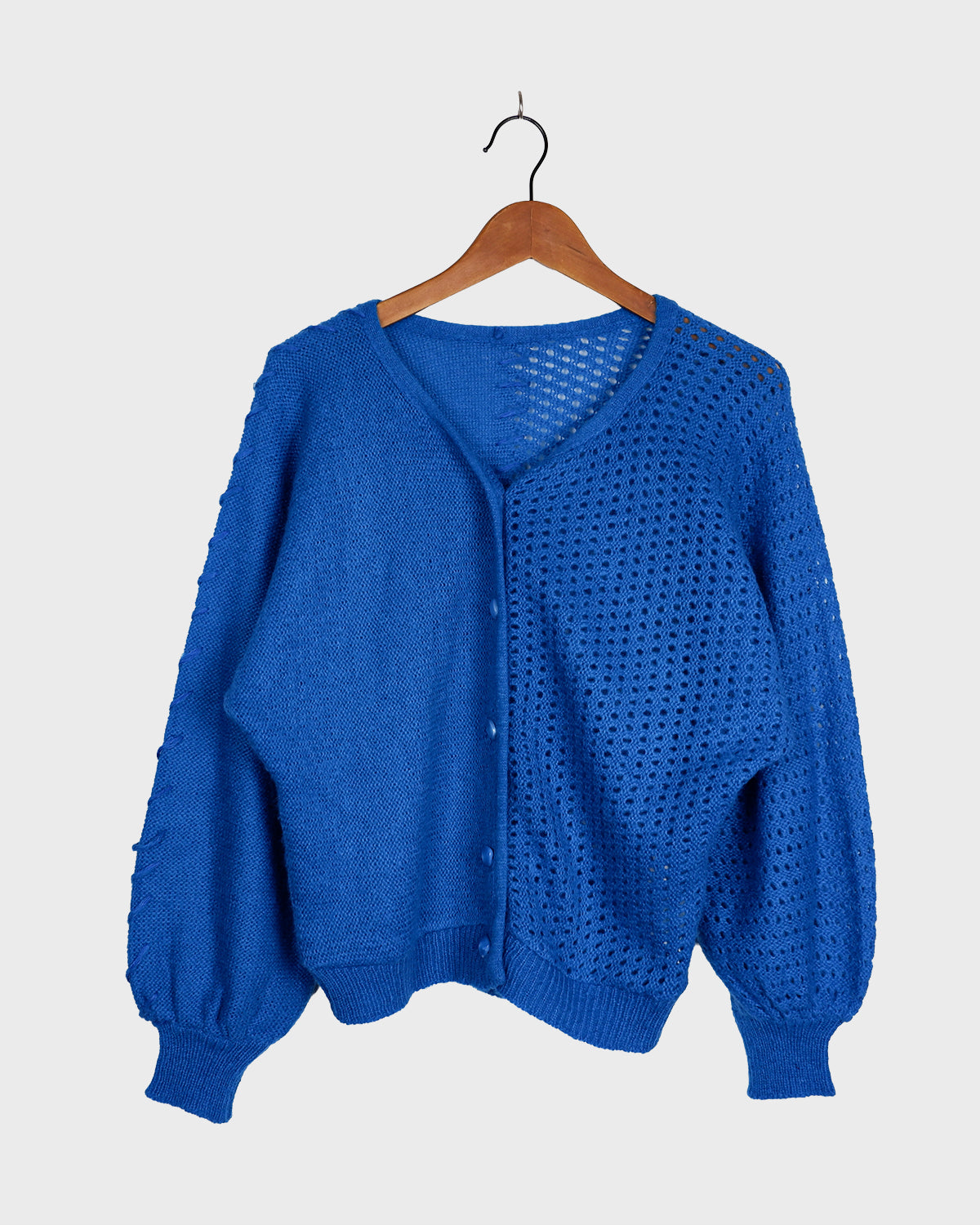 Authentic 1980s vintage cardigan in electric blue with a bold split-knit design - smooth on one side, open crochet on the other. The color is loud, the texture is cool, and the fit feels effortlessly comfortable. A rare vintage piece for people who don’t do boring.