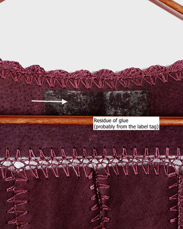 This burgundy leather vest is a vintage gem from the 80s, featuring unique stitching flowers and a boho-style cut. With no closure, it's perfect for layering over any outfit!
