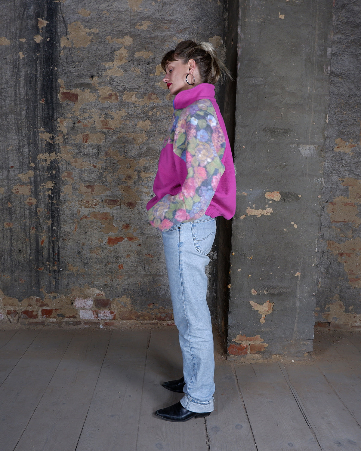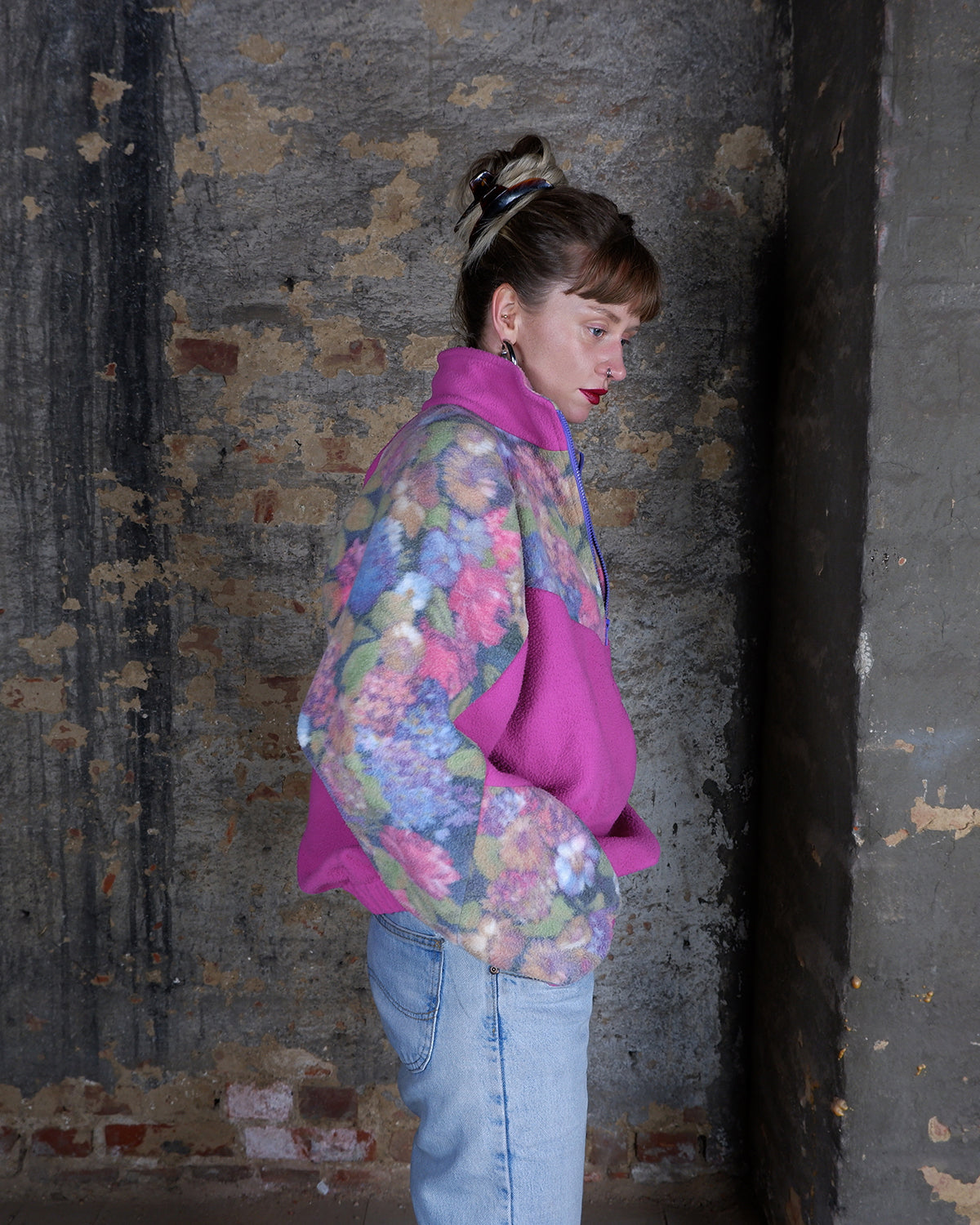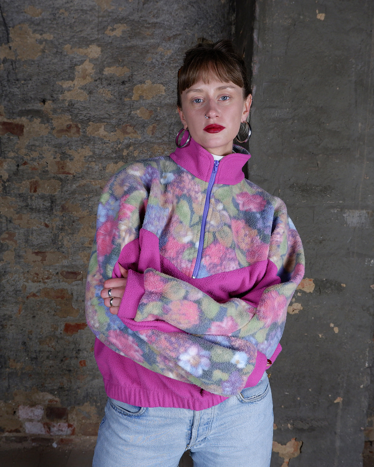 Vintage 80s 90s hot pink half zip fleece with floral pattern | M-L