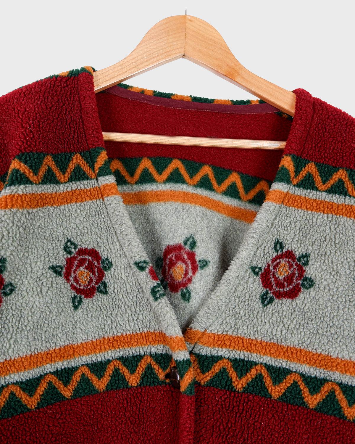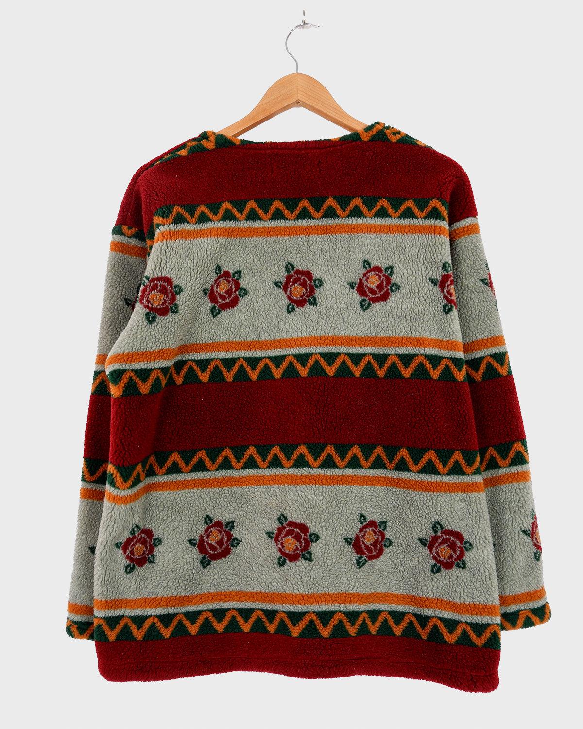 Vintage 80s red / grey boho fleece jacket with floral pattern | M
