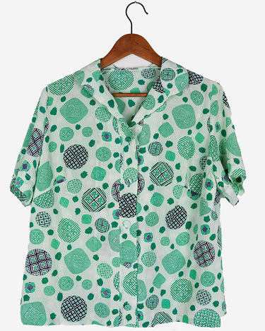 This vintage 90s green silk (crêpe georgette silk!) shirt features a playful geometric pattern in varying shades of green which creates a a lively aesthetic.