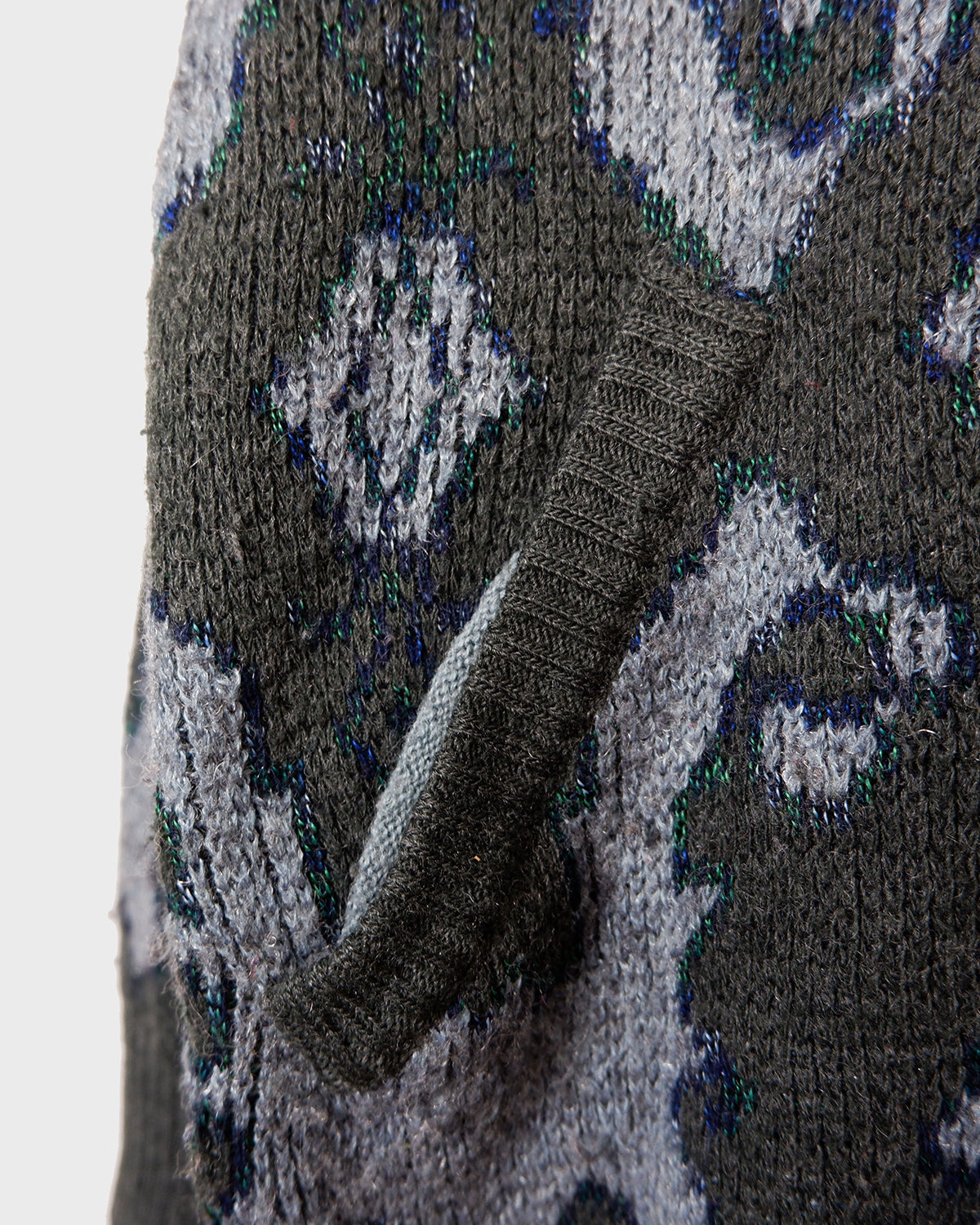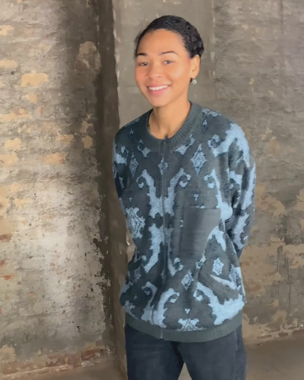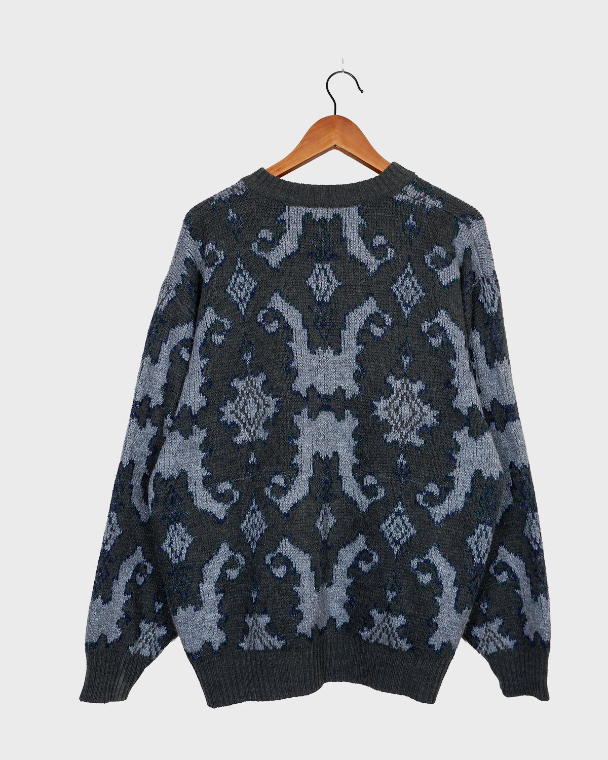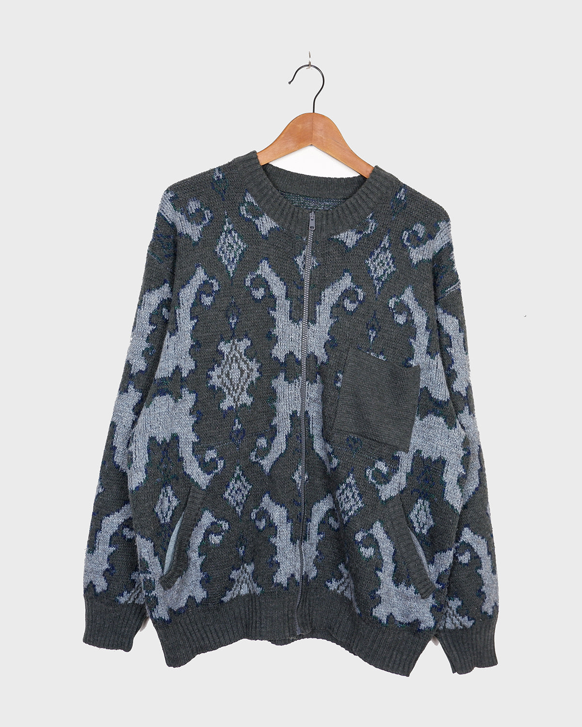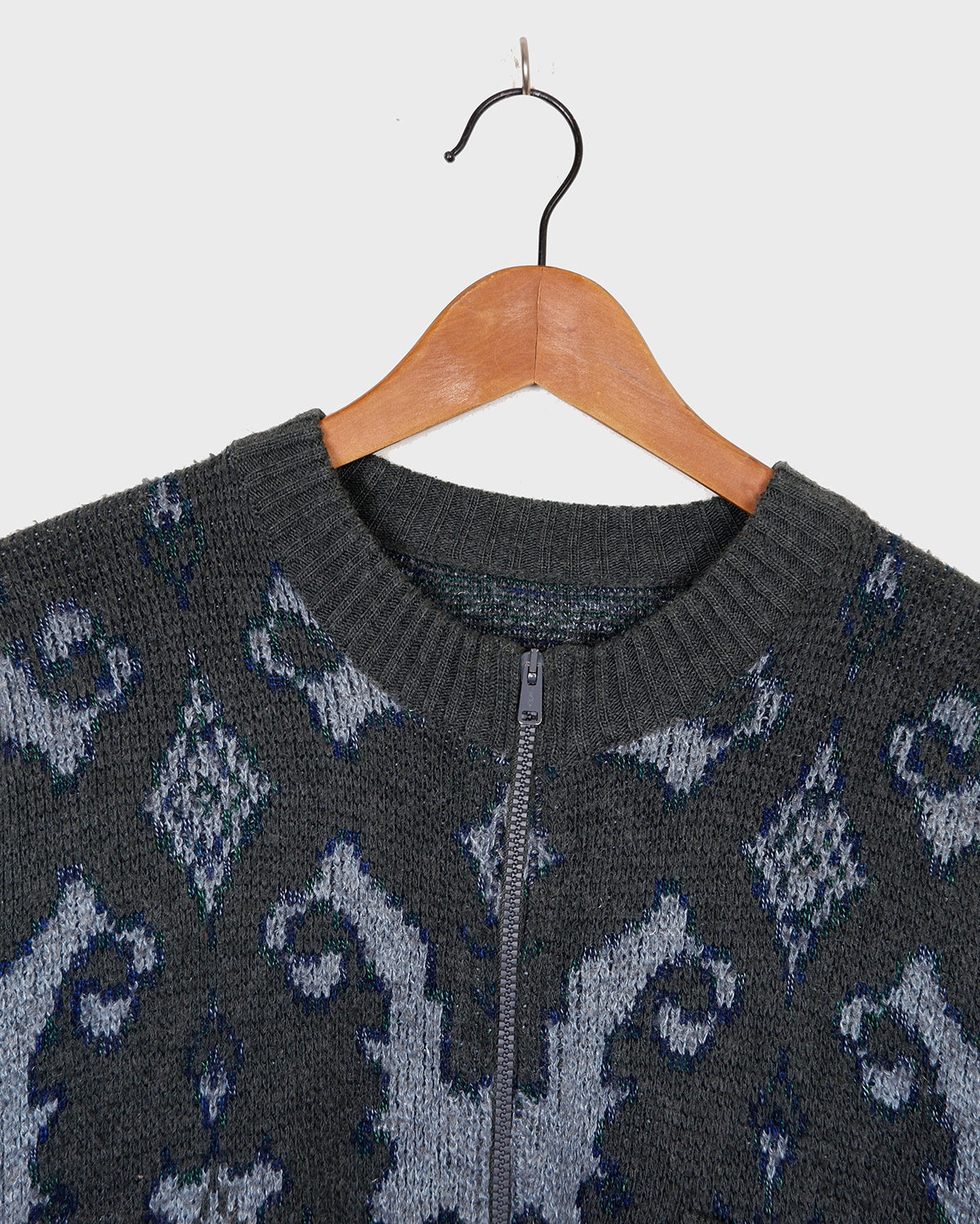 Vintage 80s 90s grey woolmix zip-up cardigan with ornament pattern and glitter accents | Size S-L