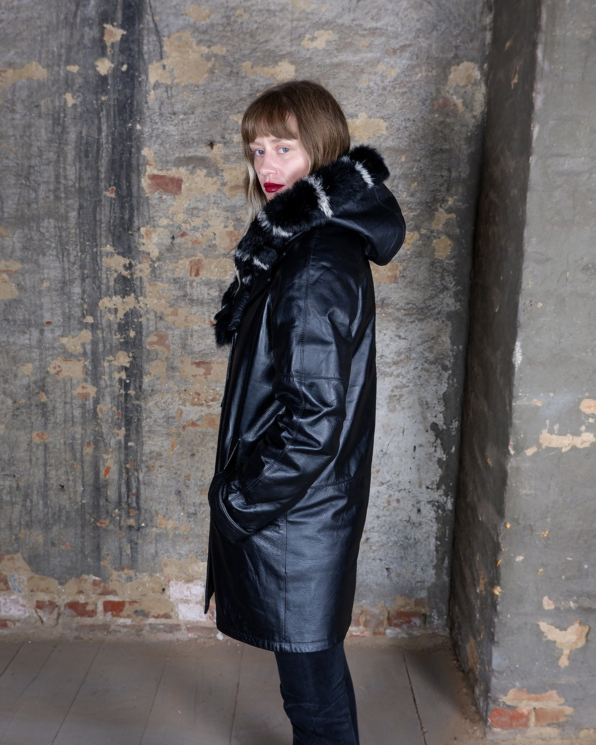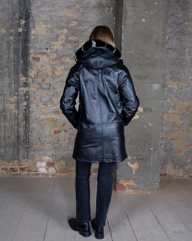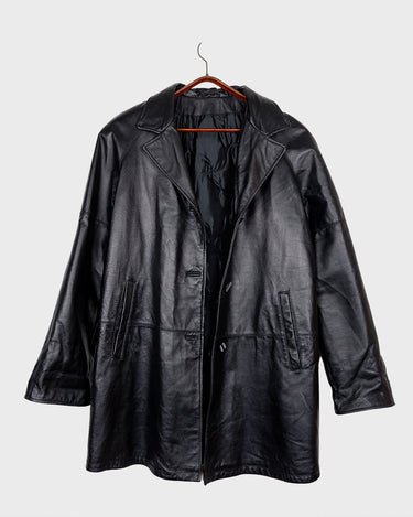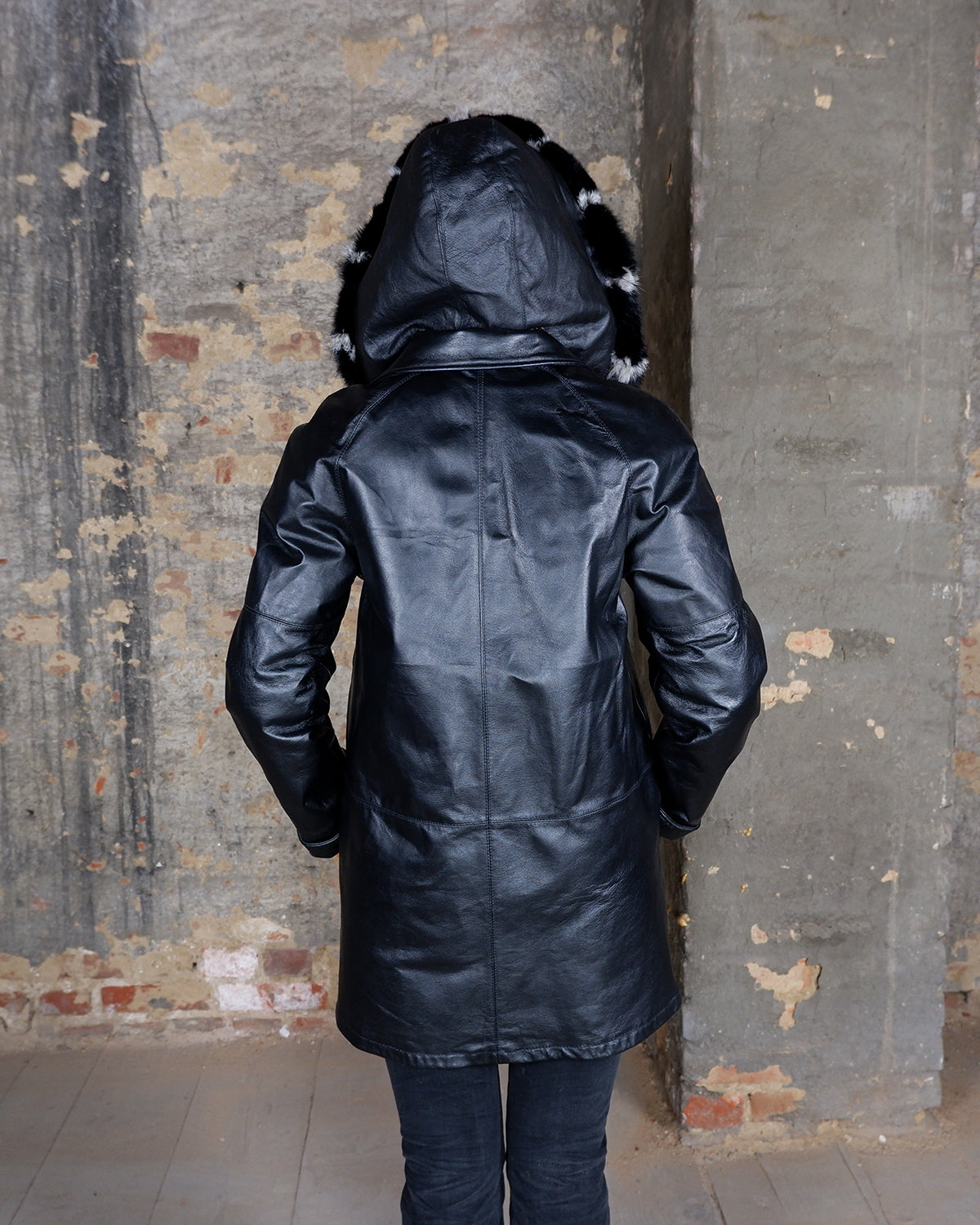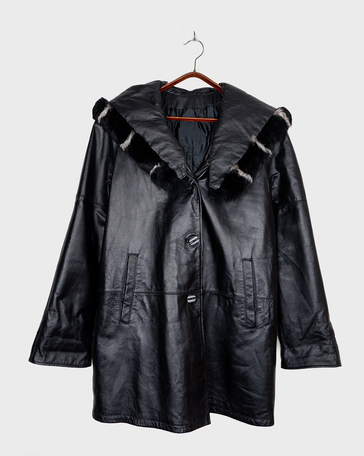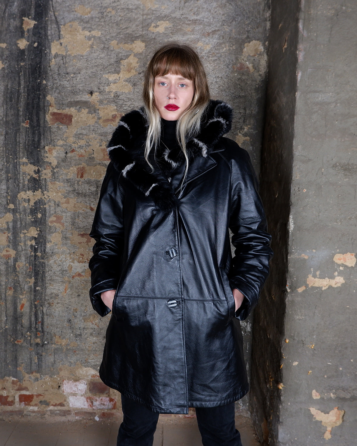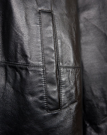 This vintage 90s Y2K leather coat features a sleek black colorway with a subtle natural leather grain pattern, delivering a timeless look. Crafted from genuine leather and finished with real fur trim on the hood, it offers both premium warmth and standout texture. A rare statement piece, perfect for elevated streetwear and collectors of authentic Y2K outerwear.