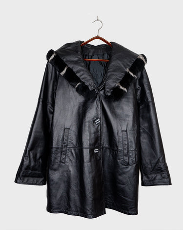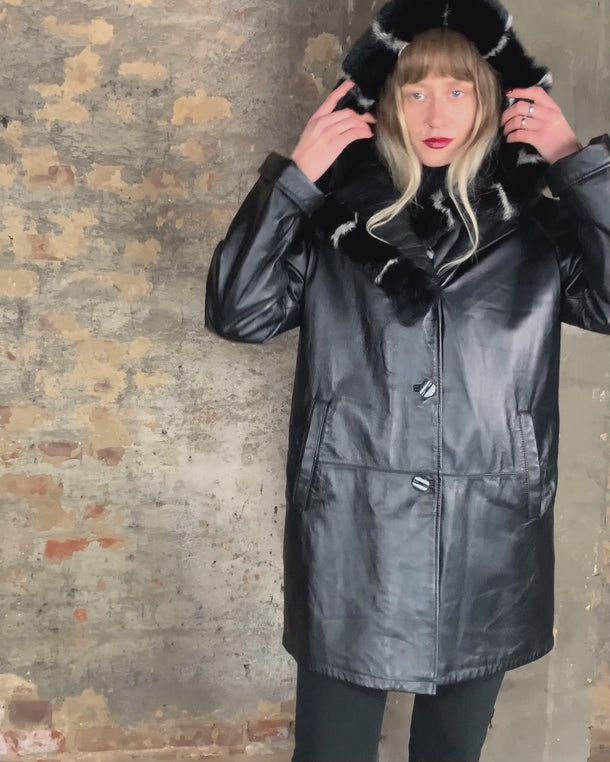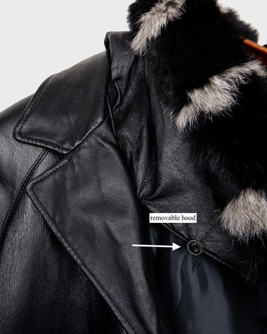 Vintage Y2k black leather short coat with removable hood and fur trim | M-L